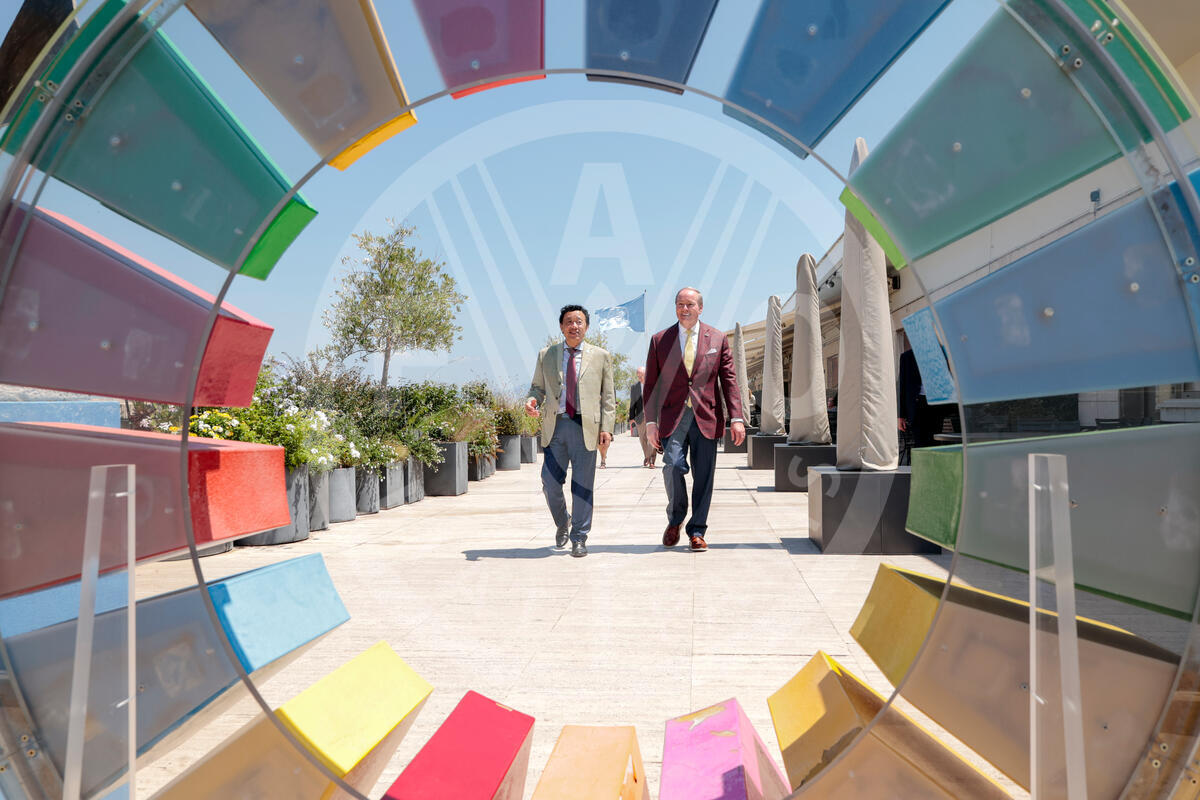 24 June 2025. Rome, Italy. FAO Director-General QU Dongyu walks on the FAO terrace with terrace with Mississippi State University President, Mark Keenum. FAO Headquarters (FAO terrace).