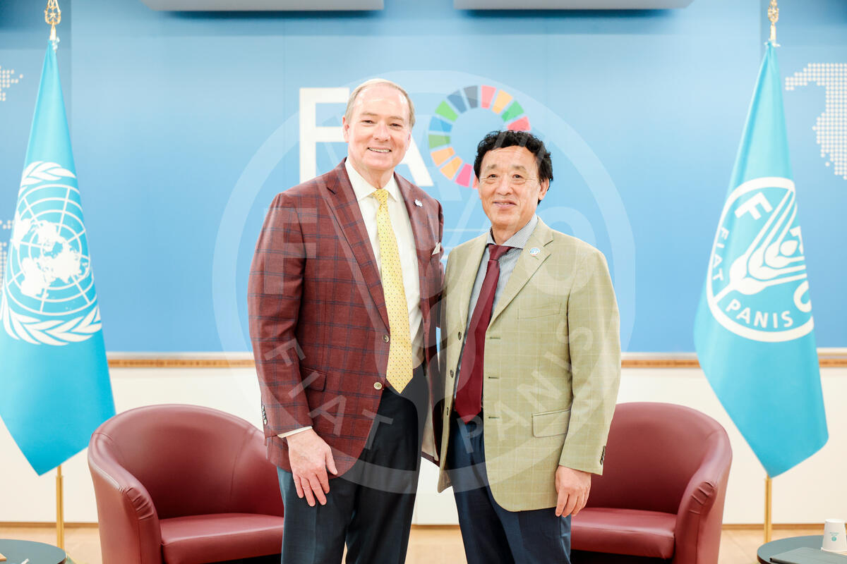 24 June 2025. Rome, Italy. FAO Director-General QU Dongyu (R) meets with Mississippi State University President, Mark Keenum. FAO headquarters, (Iraq Room).
