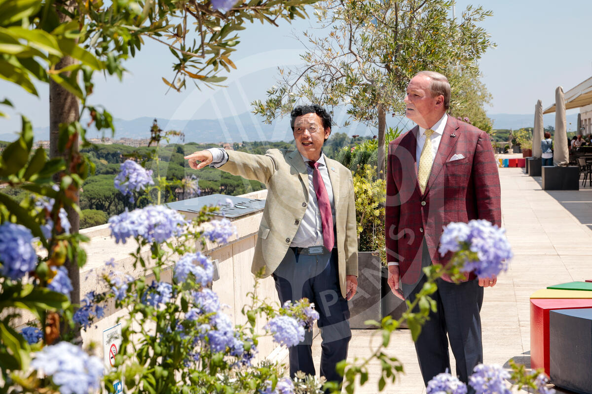 24 June 2025. Rome, Italy. FAO Director-General QU Dongyu (L) shows the view of Rome from the FAO terrace to Mississippi State University President Mark Keenum. FAO Headquarters (FAO terrace).