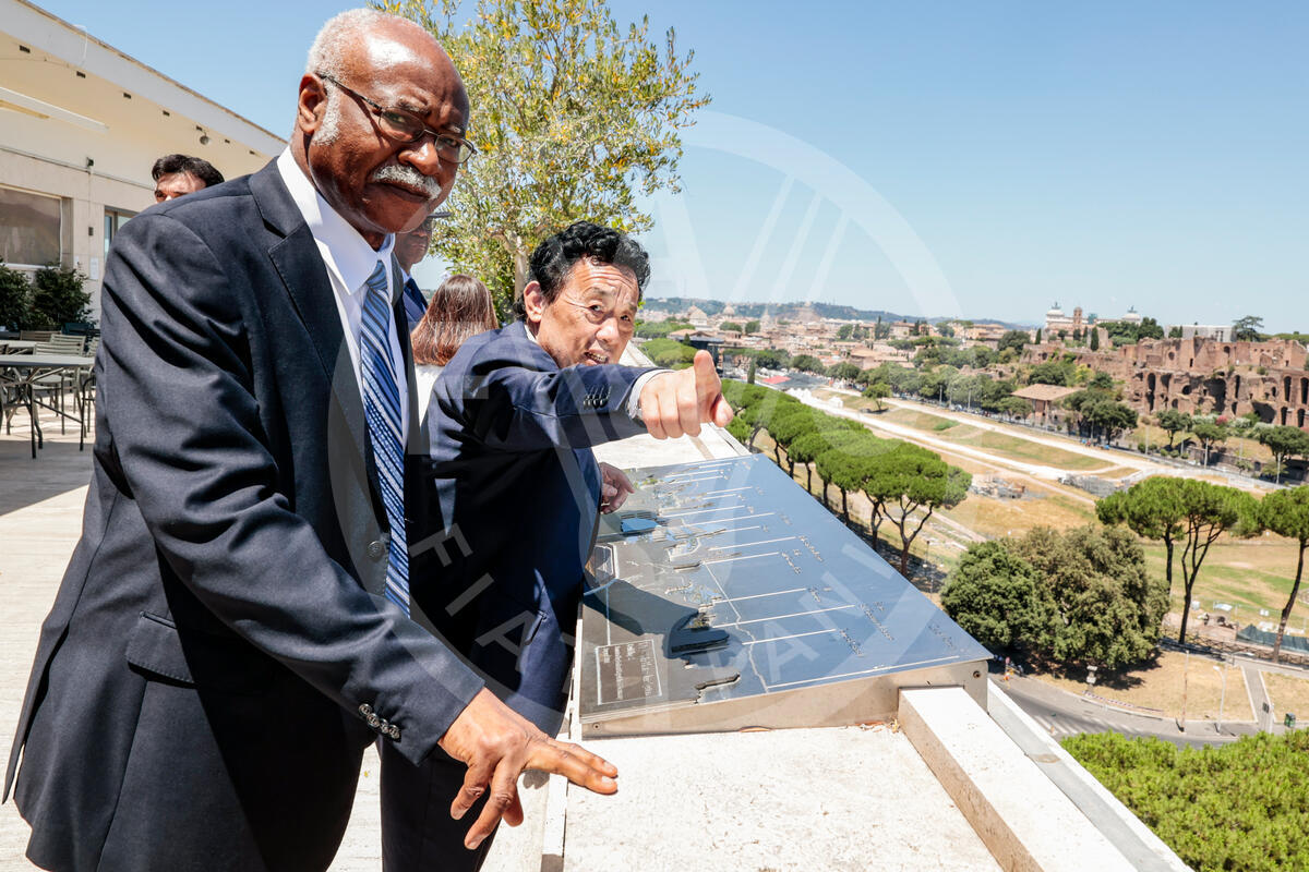 28 June 2025. Rome, Italy. FAO Director-General QU Dongyu (R) shows the FAO terrace and the view of Rome to Philemon Yang, President of the United Nations General Assembly. FAO Headquarters (Iraq Room).