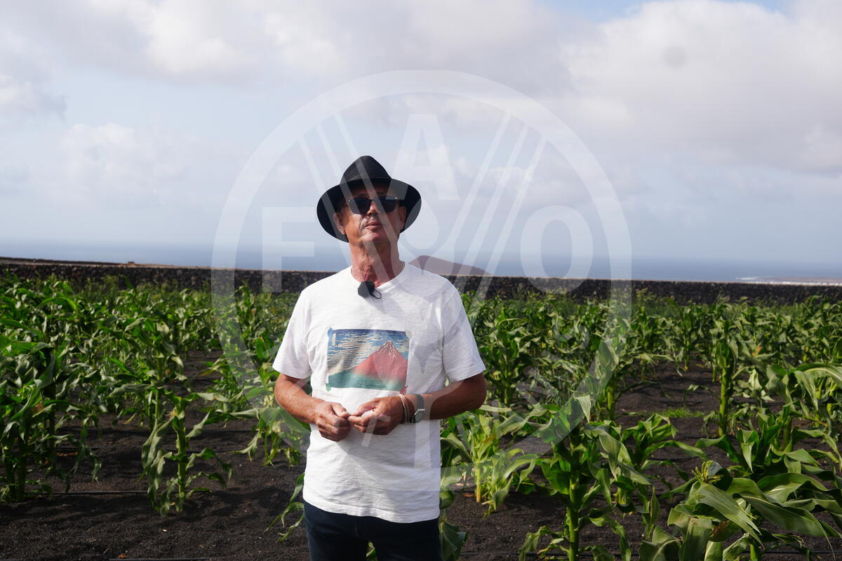 23 April 2025. Lanzarote Island, Spain. Antonio Mora stands in his farm, where he applies the 'enarenado' technique to cultivate in volcanic soil.