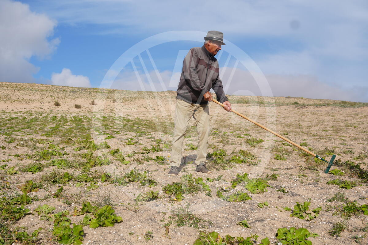 23 April 2025. Lanzarote Island, Spain. Francisco Araujo works in his jable field, preparing the land to plant sweet potatoes.