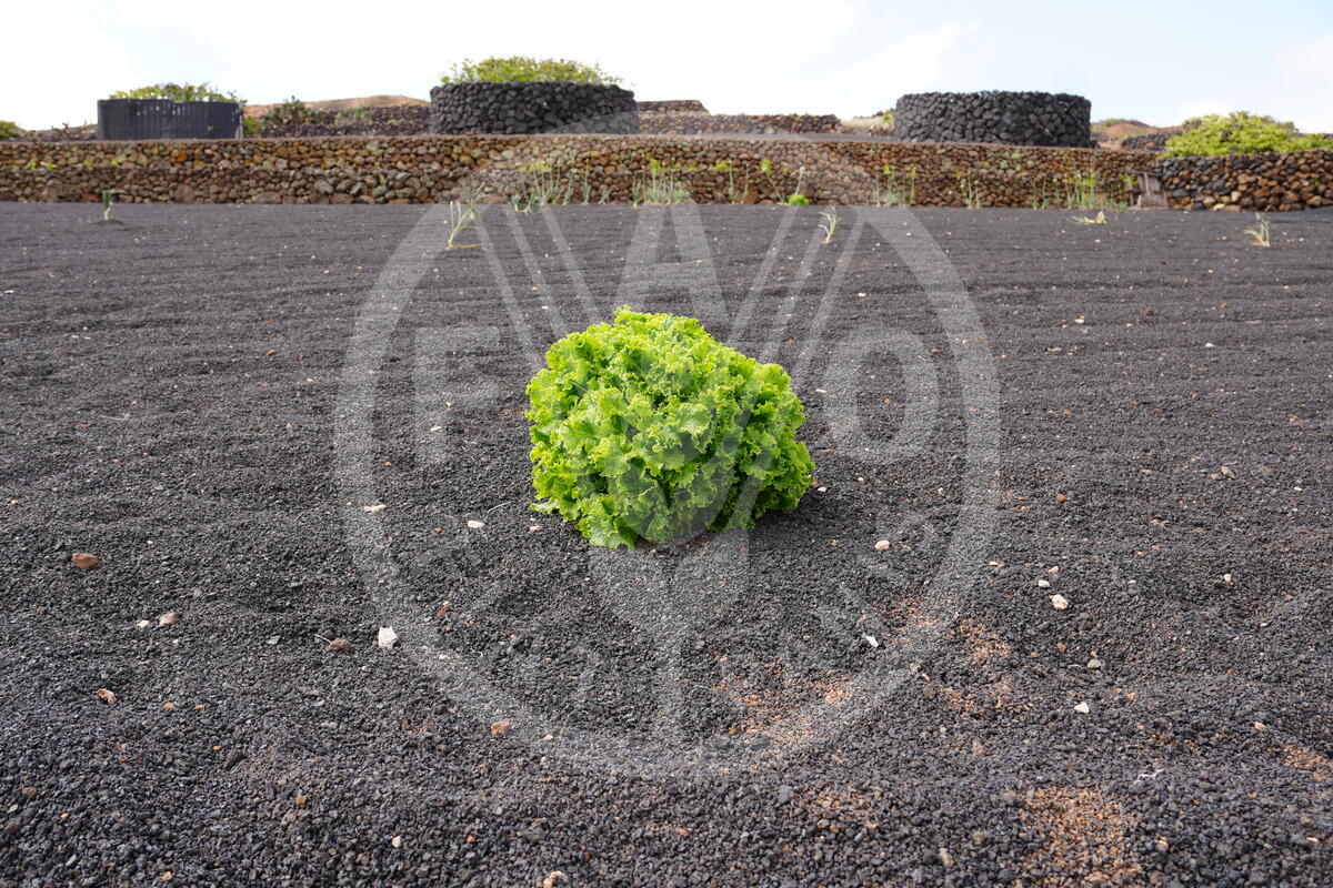 21 April 2025. Lanzarote Island, Spain. A lettuce grows from soil covered by rofe, a layer of volcanic ash.