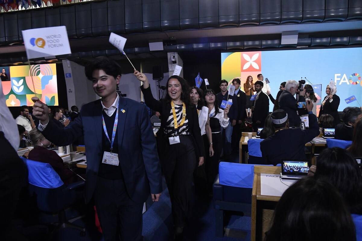 17 October 2025. FAO Rome Headquarters, Italy. YPB, YSG and National Chapters walk in front of the stage as each group leader speaks during the World Food Forum 2025 Closing Ceremony. World Food Forum (WFF) 2025.