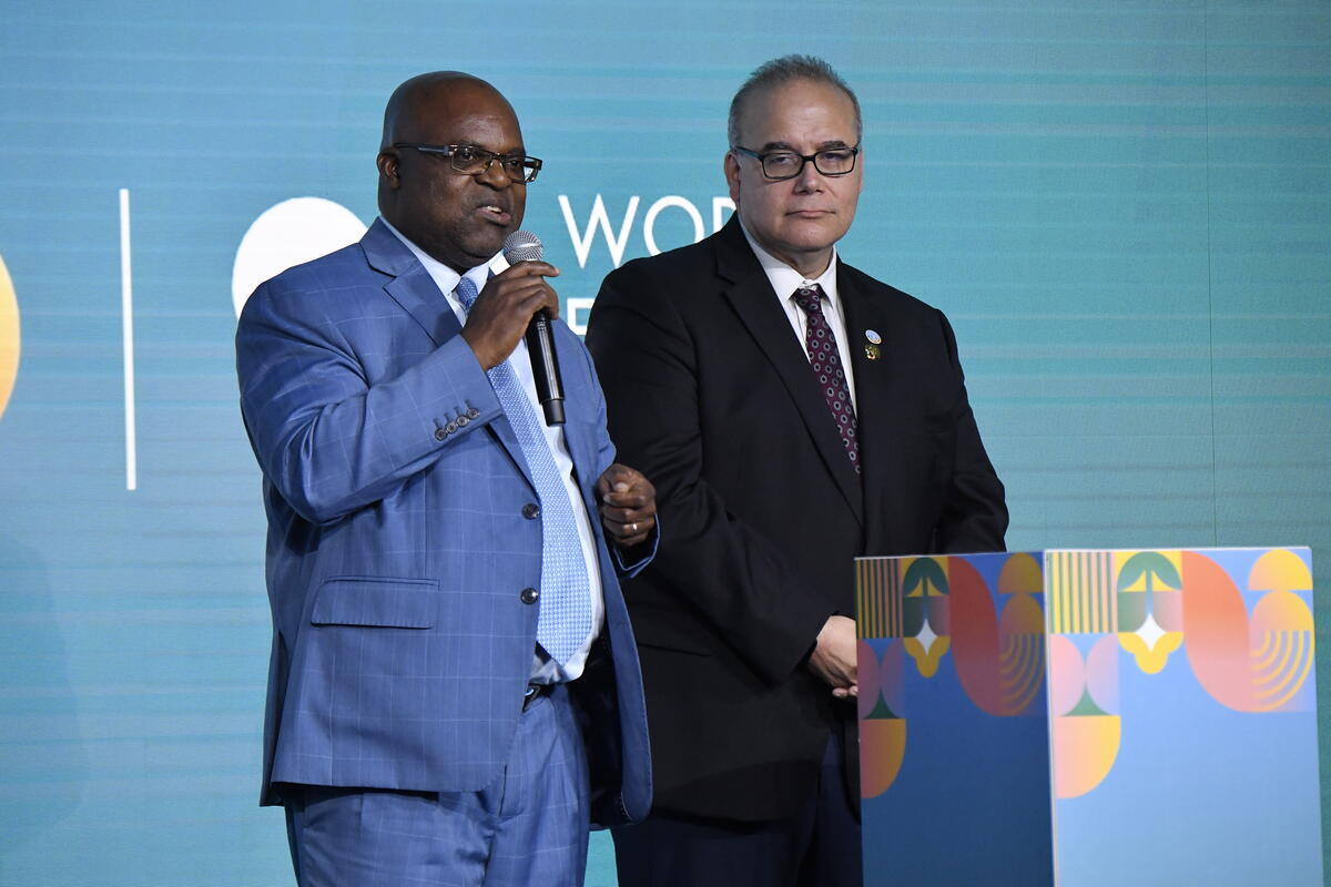 17 October 2025. FAO Headquarters, Rome, Italy. Godfrey Magwenzi, FAO Deputy Director-General, Director of Cabinet (L) delivers his address during the World Food Forum Closing Ceremony. Next to him, on his right, is Maximo Torero, FAO Chief Economist.