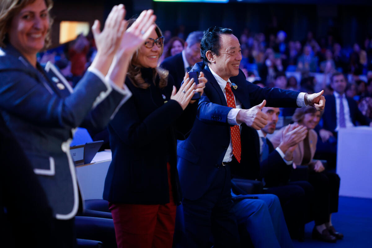 17 October 2025, Rome, Italy. FAO Director-General QU Dongyu gives thumbs up, next to Rosângela Lula da Silva, First Lady of the Federative Republic of Brazil, during the World Food Forum 2025 Closing Ceremony. The fifth edition of the World Food Forum (WFF), the largest annual gathering of agrifood systems stakeholders globally, runned at FAO headquarters in Rome from 10 to 17 October 2025. FAO Headquarters (Plenary Hall).
