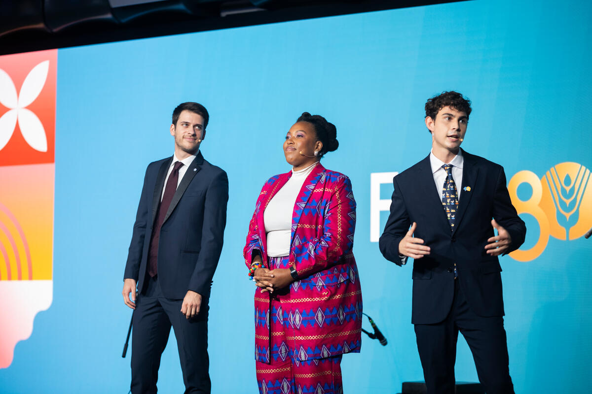 17 October 2025. FAO Headquarters, Rome, Italy. On the left Andrea Granata, Youth Delegate of Italy to the United Nations 2024/2025, in the middle Dr. Rachel V. Brown, Executive Director/Co-Founder of The Every Mikkle Foundation and a WFF Champion Together, and on the right Edward Huntley, UN FAO - Office of Youth and Women, moderate the “World Food Forum Closing Cerimony” at World Food Forum 2025.