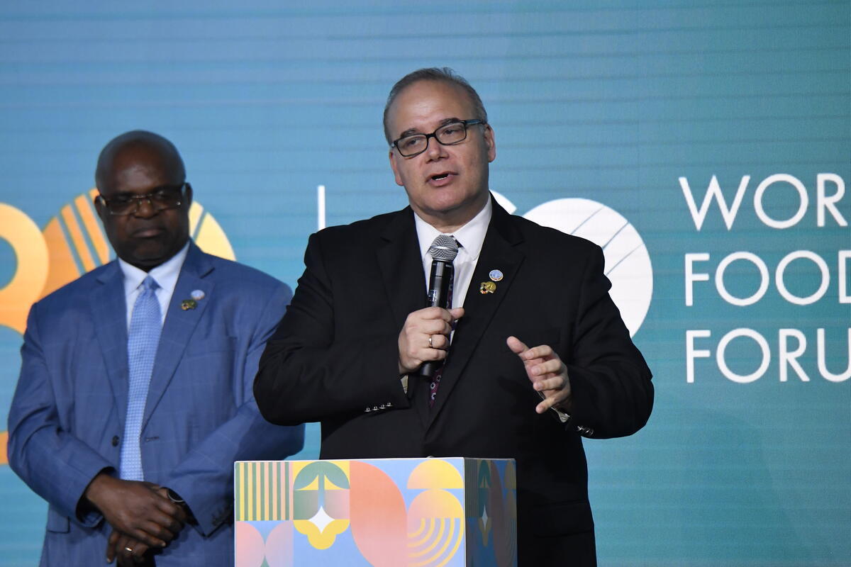17 October 2025. FAO Headquarters, Rome, Italy. Máximo Torero, FAO Chief Economist (R) delivers his address during the World Food Forum Closing Ceremony. Next to him, on his left, is Godfrey Magwenzi FAO Deputy Director-General, Director of Cabinet.