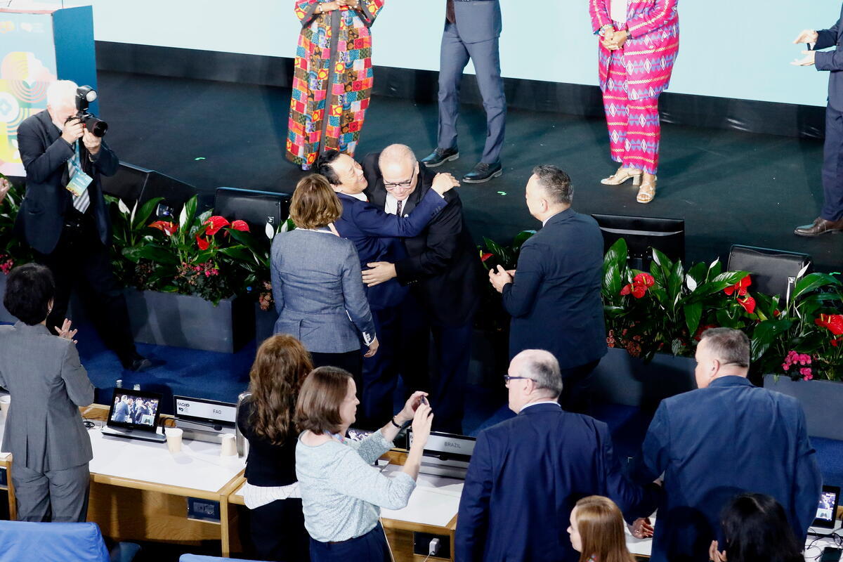 17 October 2025, FAO Rome Headquarters, Italy. FAO Director-General QU Dongyu celebrating the end of the World Food Forum 2025.
