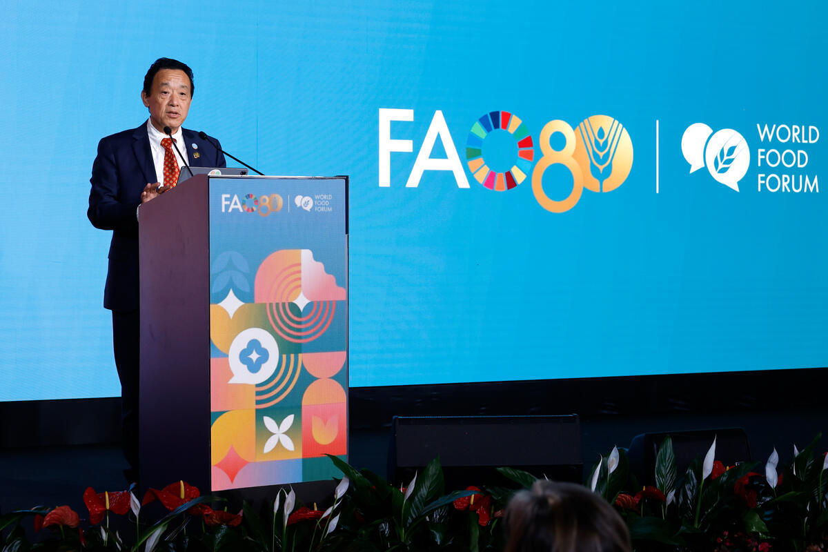 17 October 2025, Rome, Italy. FAO Director-General QU Dongyu delivers his address during the World Food Forum 2025 Closing Ceremony. The fifth edition of the World Food Forum (WFF), the largest annual gathering of agrifood systems stakeholders globally, runned at FAO headquarters in Rome from 10 to 17 October 2025. FAO Headquarters (Plenary Hall).