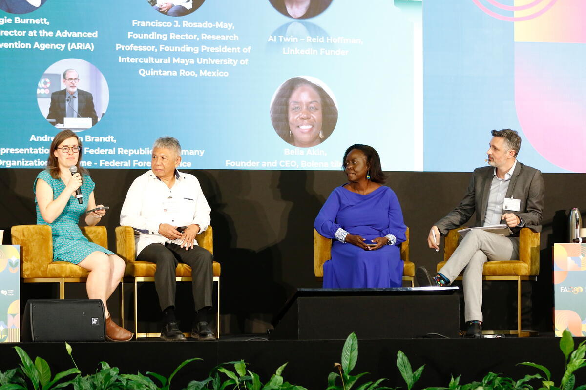 From right to left, Kal Joffres, CEO and Co-Funder of Tandemic, moderates the Future of Science, Technology and Innovation in Agrifood Systems panel session together with Bella Akinyi, Founder of Bolena Tilapia, Francisco Rosado-May, Founding President of Universidad Intercultural Maya de Quintana Roo Mexico and Angie Burnett, Programme Director at the Advanced Research + Invention Agency (ARIA).