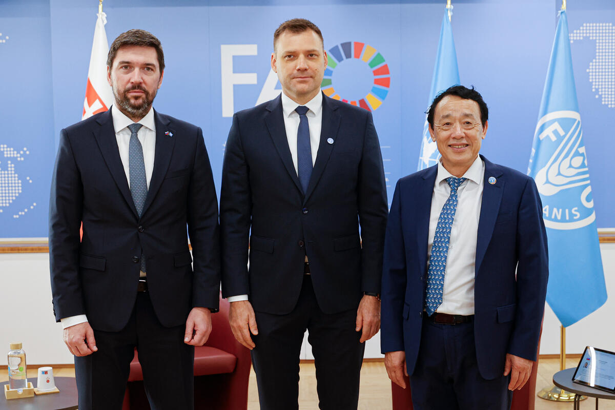 18 October 2025, Rome, Italy. FAO Director-General QU Dongyu (R) stands next to Slovakia Deputy Prime Minister Tomáš Taraba and Richard Takác Minister for Agriculture and Rural Development of the Slovak Republic (L). FAO headquarters, (Iraq Room).