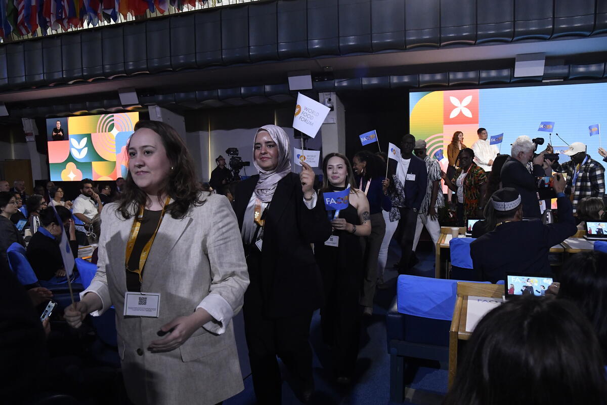 17 October 2025. FAO Rome Headquarters, Italy. YPB, YSG and National Chapters walk in front of the stage as each group leader speaks during the World Food Forum 2025 Closing Ceremony. World Food Forum (WFF) 2025.