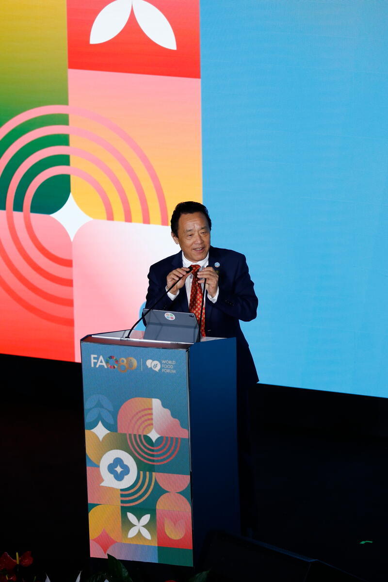 17 October 2025, FAO Rome Headquarters, Italy. FAO Director-General QU Dongyu delivers his address during the World Food Forum 2025 Closing Ceremony.