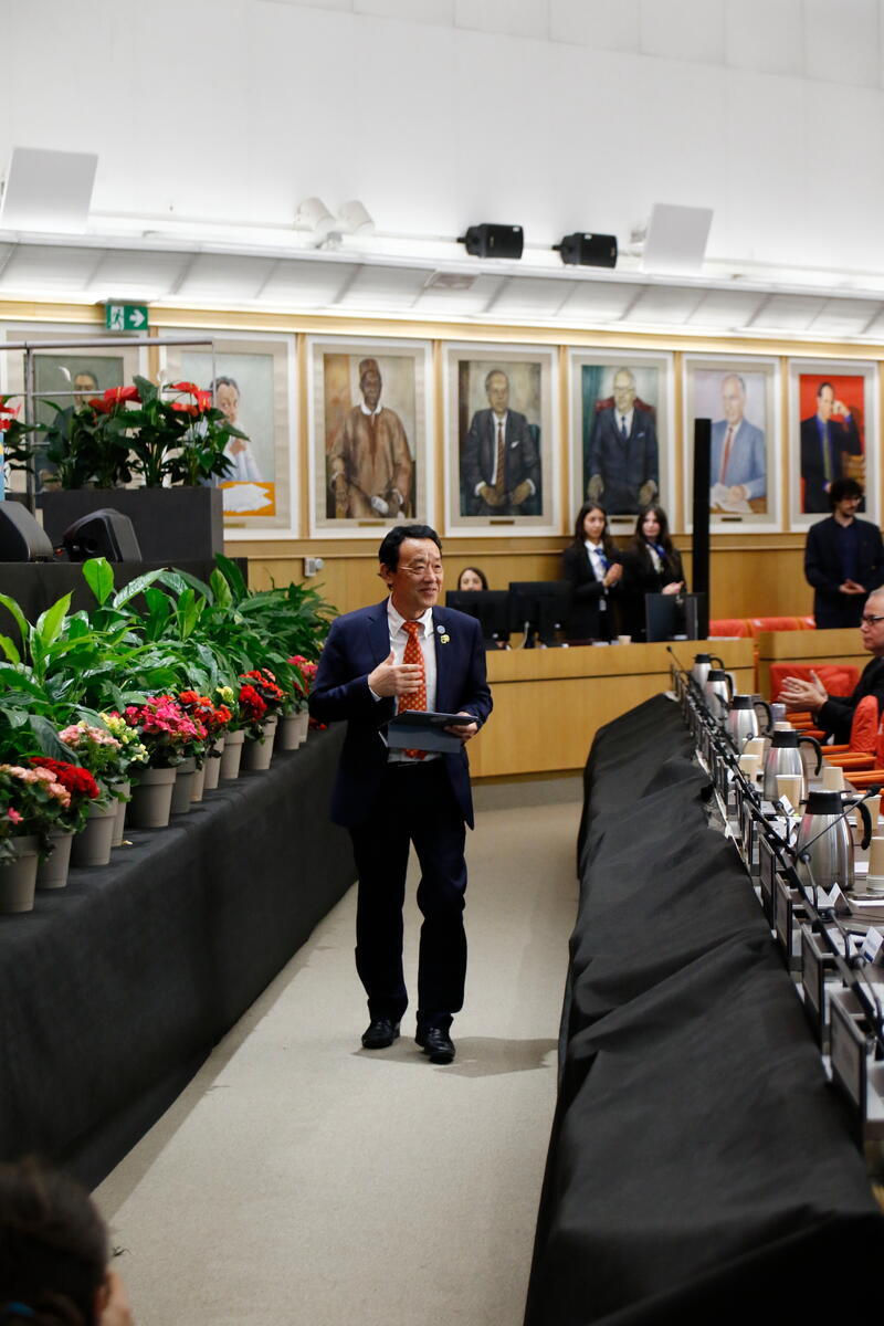 FAO's Director General QU Dongyu walks on stage at the Bridging investments and smallholder farmers for resilient coffee value chains high-level event.