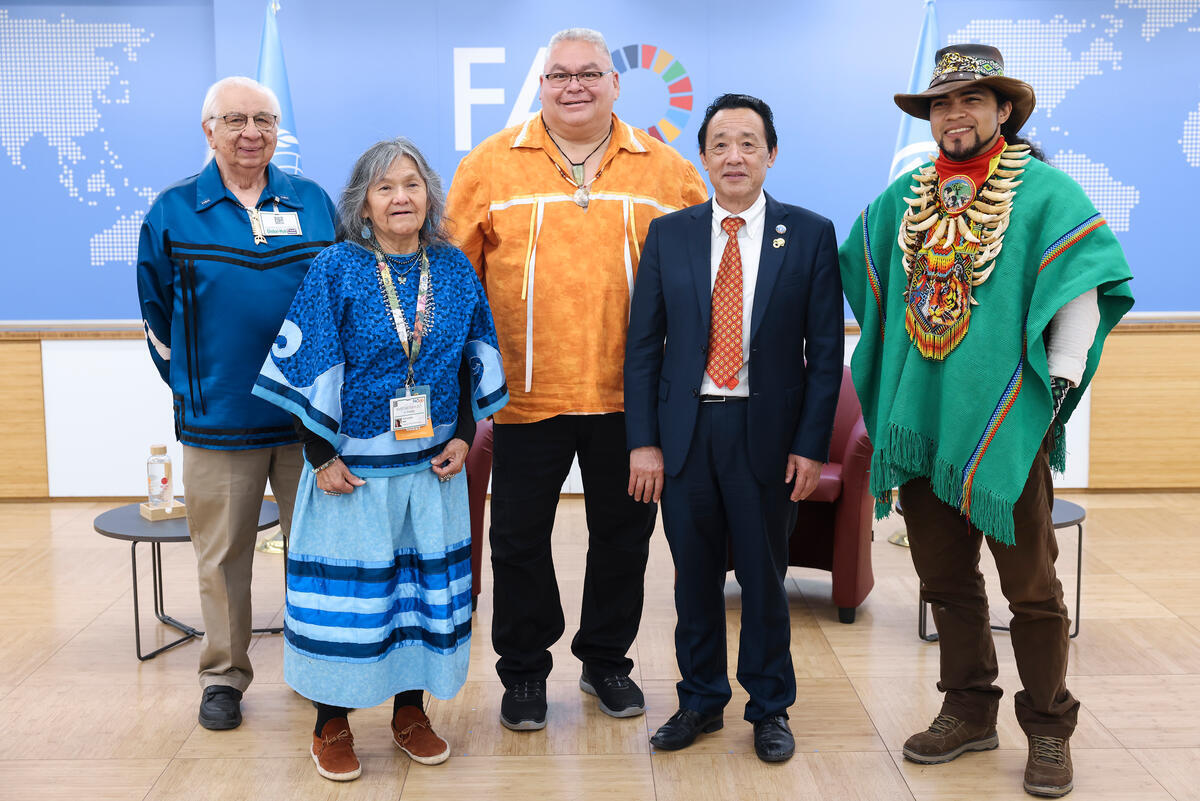 17 October 2025, Rome, Italy. FAO Director-General QU Dongyu meets with Haudenosaunee Confederacy Chief Deskaheh Steven Jacobs (C Left) and delegation. FAO Headquarters. (Iraq room)
