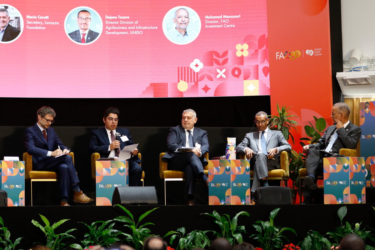 From left to right, Francesco Rampa, Head of Sustainable Food Systems European Centre for Development Policy Management (ECDPM), moderates the panel session with Telce Gonzalez Morera, Vice Minister for Agriculture Cuba, Mario Cerutti, Secretary Lavazza, Dejene Tezera, Director Division of Agribusiness and Infrastructure Development UNIDO and Mohamed Manssouri, Director FAO Investment Centre.