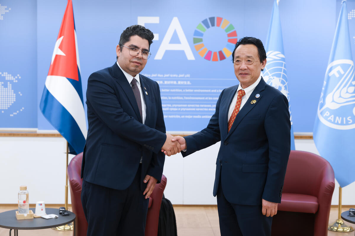 17 October 2025, Rome, Italy. FAO Director-General QU Dongyu meets with Cuba Deputy Minister for Agriculture Telce Gonzalez Morera. (Iraq room)