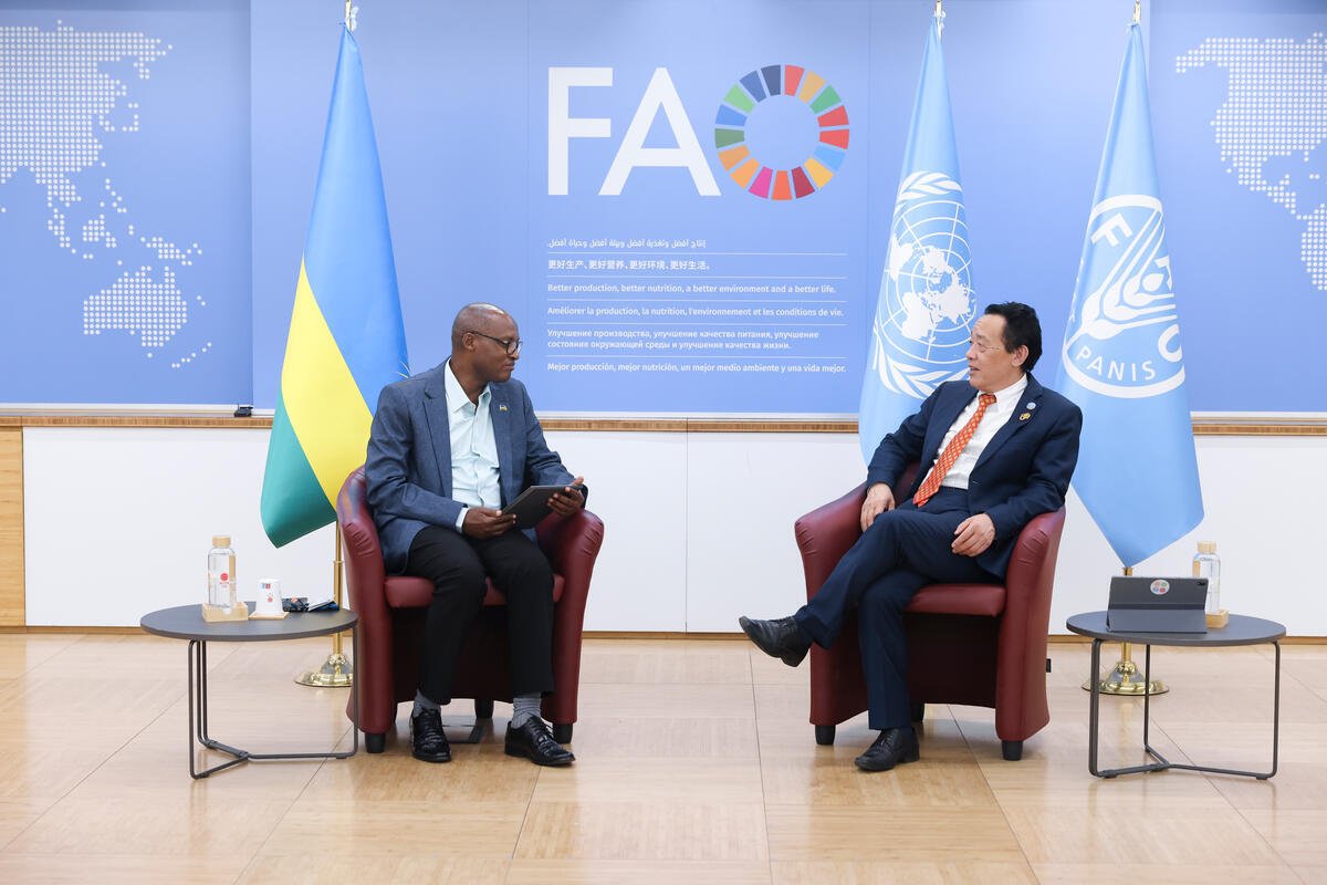 2025 ITALY. FAO Director-General QU Dongyu meets with Rwanda Minister for Agriculture Animal Resources Mark Cyubahiro Bagabe