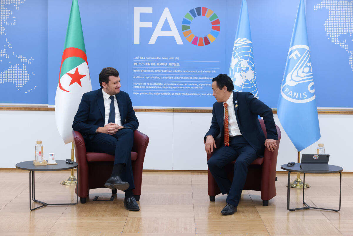 2025 ITALY. FAO Director-General QU Dongyu meets with Algeria Minister Agriculture Rural Development Fisheries Yacine El-Mahdi Oualid