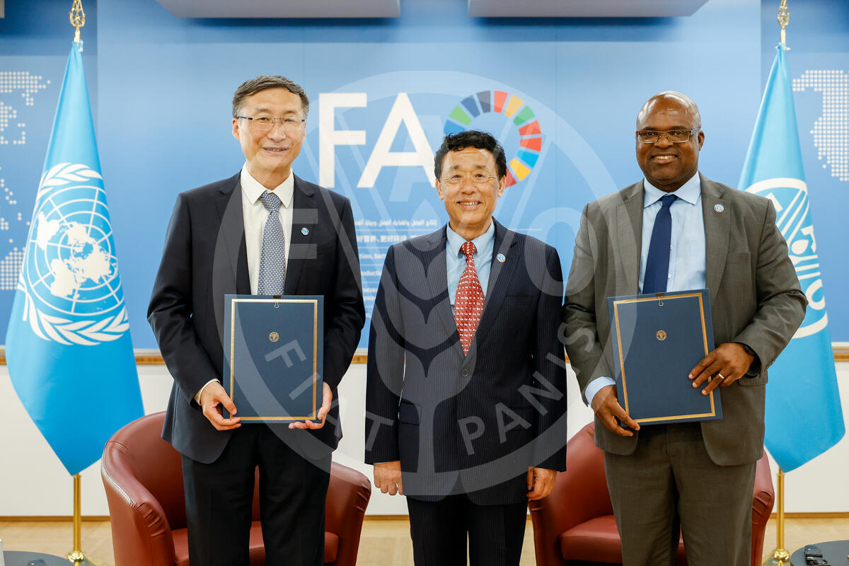 12 June 2025. Rome, Italy. FAO Director-General QU Dongyu (C) poses for a group photo with Godfrey Magwenzi (R), FAO Deputy Director-General, and Zhang Junfeng (L), President of the Ocean University of China, after the signing of a Memorandum of Understanding (MoU) between FAO and the Ocean University of China. FAO Headquarters (Iraq Room).