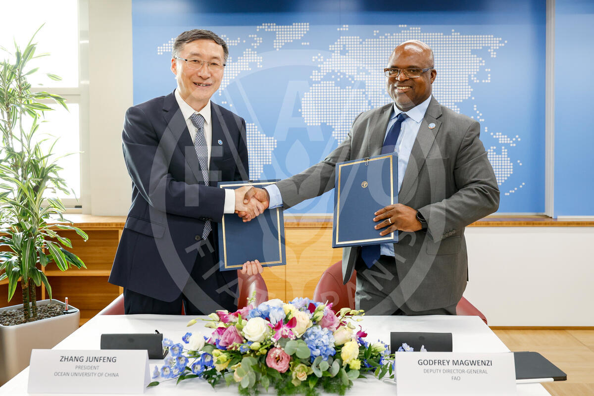 12 June 2025. Rome, Italy. Godfrey Magwenzi (R), Deputy Director-General of FAO, shakes hands with Zhang Junfeng (L), President of the Ocean University of China, after the signing of a Memorandum of Understanding (MoU) between FAO and the Ocean University of China. FAO Headquarters (Iraq Room).