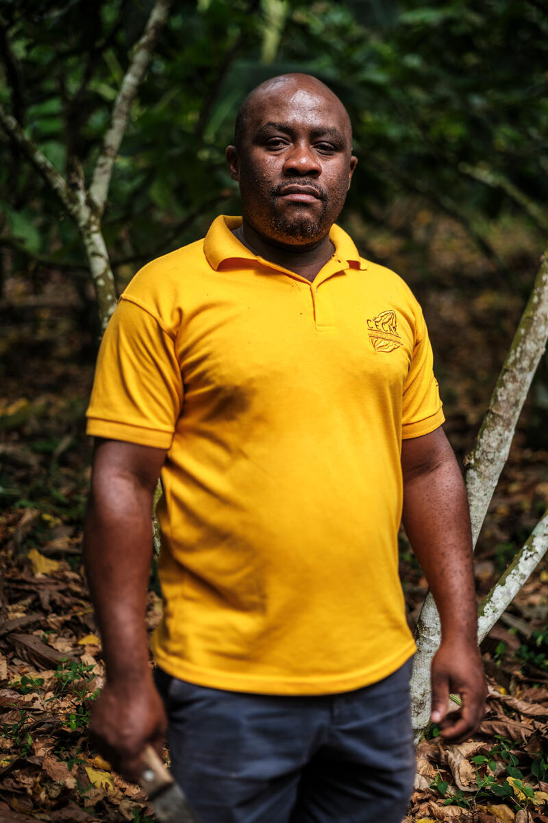 02 June 2025. Queluz, Sao Tome e Principe. Dodamin Semedo Correia, farmer, is portrayed in his cocoa field.