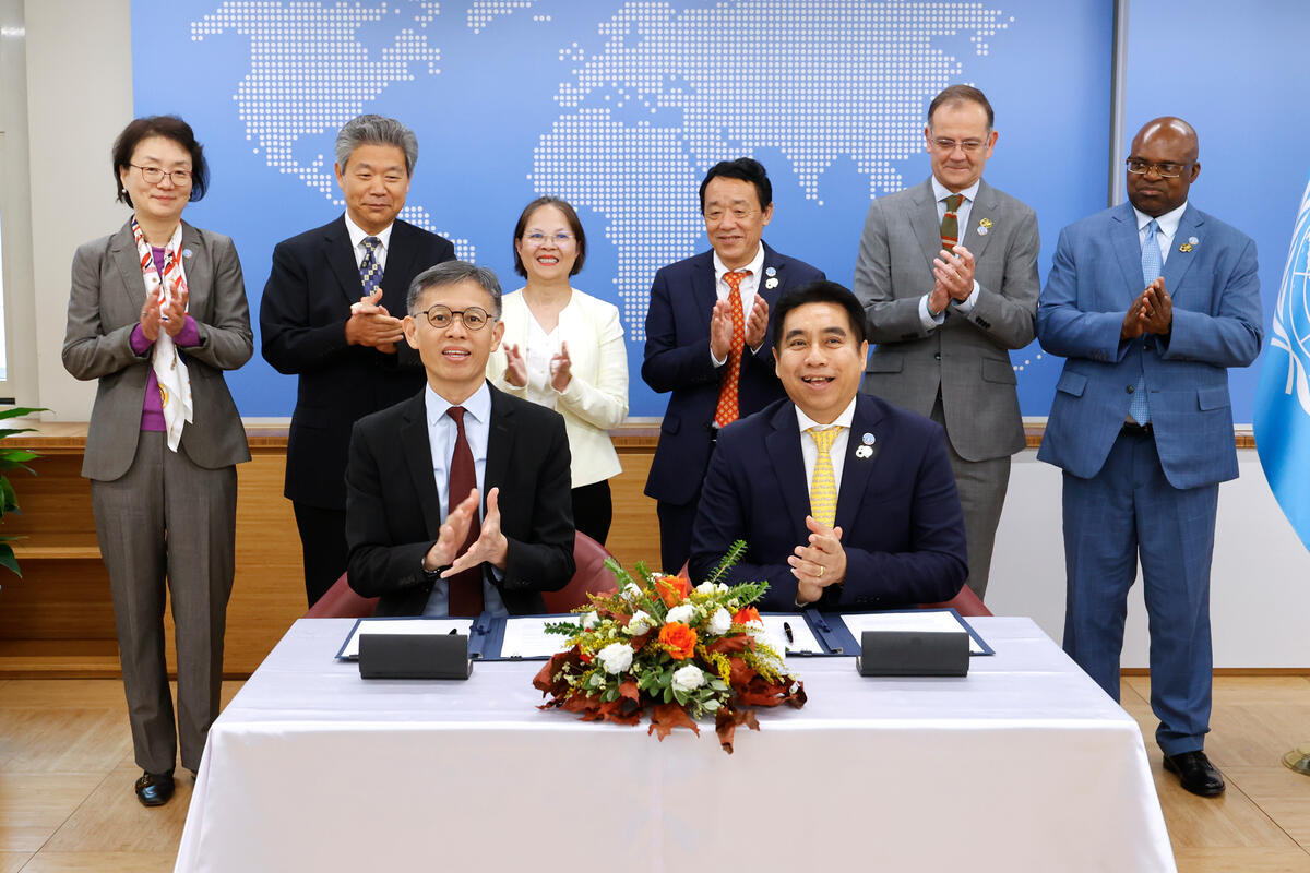 17 October 2025. FAO Headquarters, Rome, Italy. FAO Director-General QU Dongyu (4-R) and Ms. Diane Wong (4-L), Under Secretary for Environment and Ecology of the Hong Kong Special Administrative Region, applaud moments after Mr. Lai Kin Ming (3-L), Director of Agriculture, Fisheries and Conservation, Agriculture, Fisheries and Conservation Department (AFCD), Hong Kong Special Administrative Region, and Dr. Thanawat Tiensin (3-R), Assistant Director-General, Director of the Animal Production and Health Division, and Chief Veterinarian at FAO, signed a Letter of Intent. (Venue: Iraq Room.)