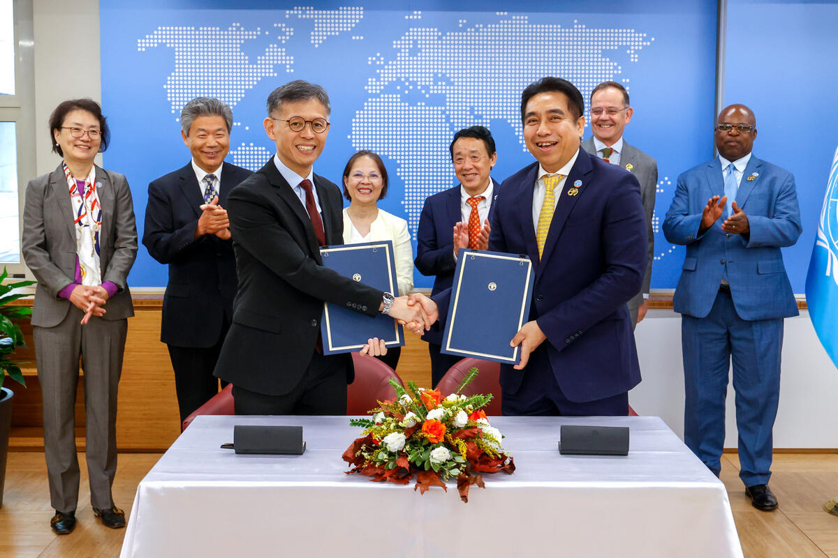 17 October 2025. FAO Headquarters, Rome, Italy. FAO Director-General QU Dongyu (4-R) and Ms. Diane Wong (4-L), Under Secretary for Environment and Ecology of the Hong Kong Special Administrative Region, applaud as Mr. Lai Kin Ming (3-L), Director of Agriculture, Fisheries and Conservation, Agriculture, Fisheries and Conservation Department (AFCD), Hong Kong Special Administrative Region, and Dr. Thanawat Tiensin (3-R), Assistant Director-General, Director of the Animal Production and Health Division, and Chief Veterinarian at FAO, shake hands after signing a Letter of Intent. (Venue: Iraq Room.)