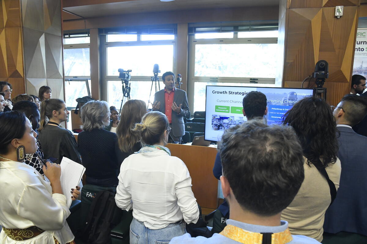 16 October 2025, Rome, Italy. Participants join the pitch battle during the event Seed to Scale: Agrifood pitch battle. World Food Forum (WFF) 2025. The fifth edition of the World Food Forum (WFF), the largest annual gathering of agrifood systems stakeholders globally, runs at FAO headquarters in Rome from 10 to 17 October 2025. FAO Headquarters (Green Room).