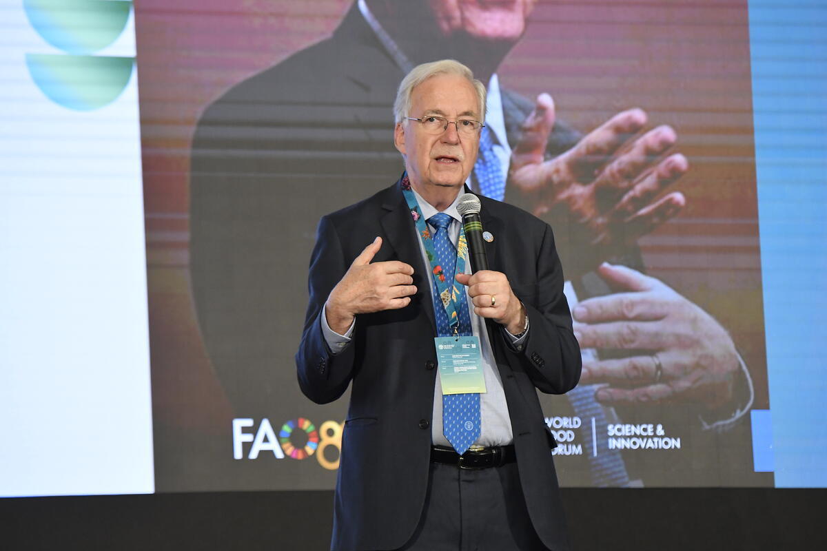 16 October 2025, Rome, Italy. Daniel Gustafson, Special Representative of the Director-General at FAO speaks during the event Seed to Scale: Agrifood pitch battle. World Food Forum (WFF) 2025. The fifth edition of the World Food Forum (WFF), the largest annual gathering of agrifood systems stakeholders globally, runs at FAO headquarters in Rome from 10 to 17 October 2025. FAO Headquarters (Green Room).