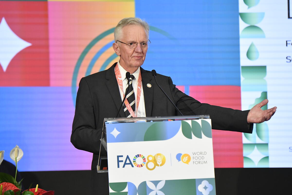 16 October 2025, Rome, Italy. Bernhard van Lengerich, founder and CEO of Seeding the Future Foundation gives a speech during the event Seed to Scale: Agrifood pitch battle. World Food Forum (WFF) 2025. The fifth edition of the World Food Forum (WFF), the largest annual gathering of agrifood systems stakeholders globally, runs at FAO headquarters in Rome from 10 to 17 October 2025. FAO Headquarters (Green Room).
