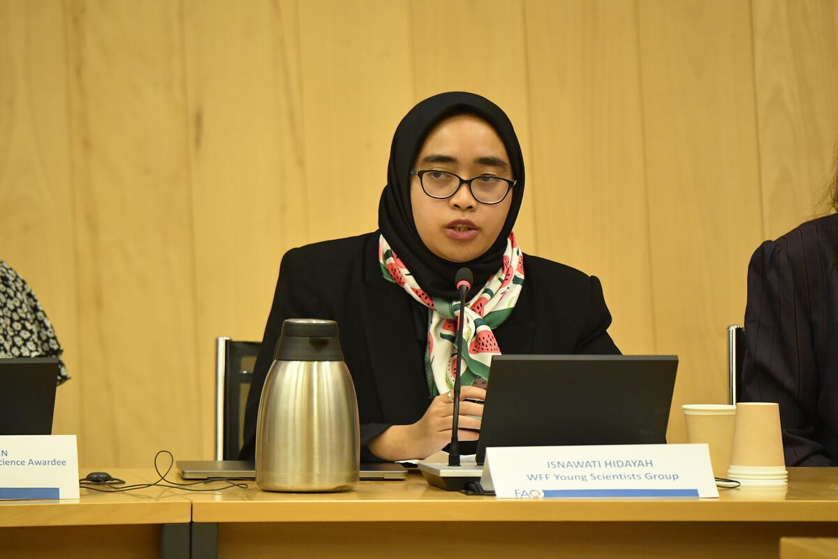 16 October 2025, Rome, Italy. Isnawati Hidayah, Young Scientists Group speaks during the event Empowering women and girls in science for agrifood systems transformation. World Food Forum (WFF) 2025. The fifth edition of the World Food Forum (WFF), the largest annual gathering of agrifood systems stakeholders globally, runs at FAO headquarters in Rome from 10 to 17 October 2025. FAO Headquarters (German Room).