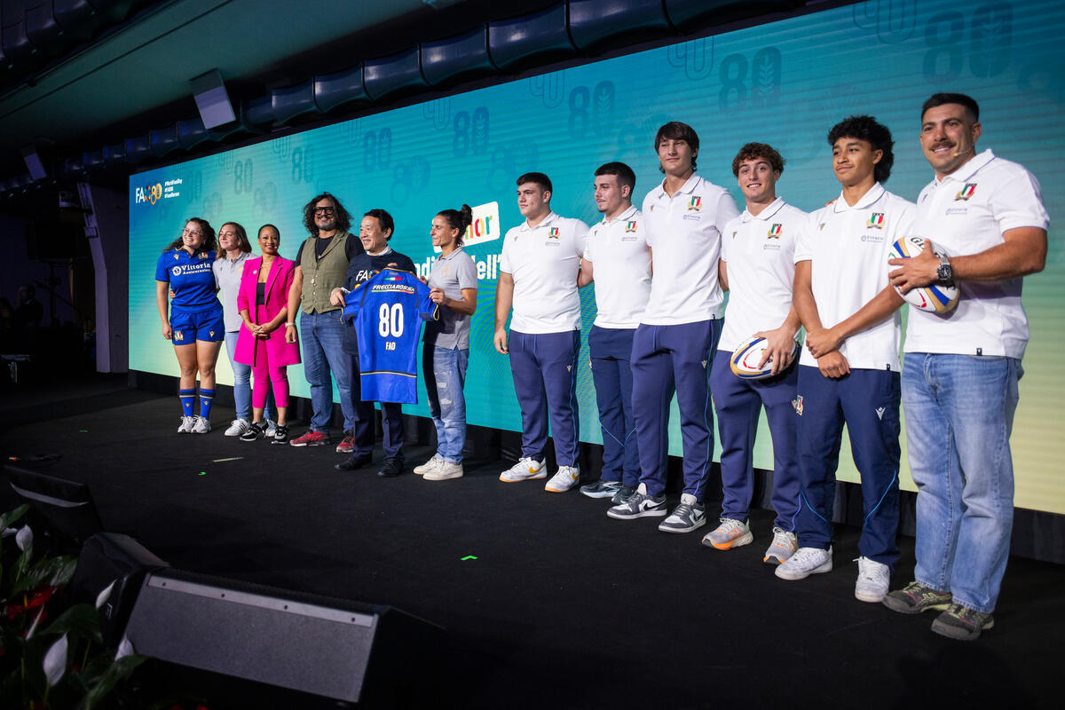 17 October 2025, Rome, Italy. FAO Director-General QU Dongyu receives a t-shirt from the Italian Rugby Federation during the Junior World Food Day 2025 ceremony. World Food Forum 2025. This year’s World Food Day coincides with FAO’s 80th anniversary, reflecting decades of work to boost food production, reduce poverty, and respond to crises. FAO Headquarters (Plenary Hall).