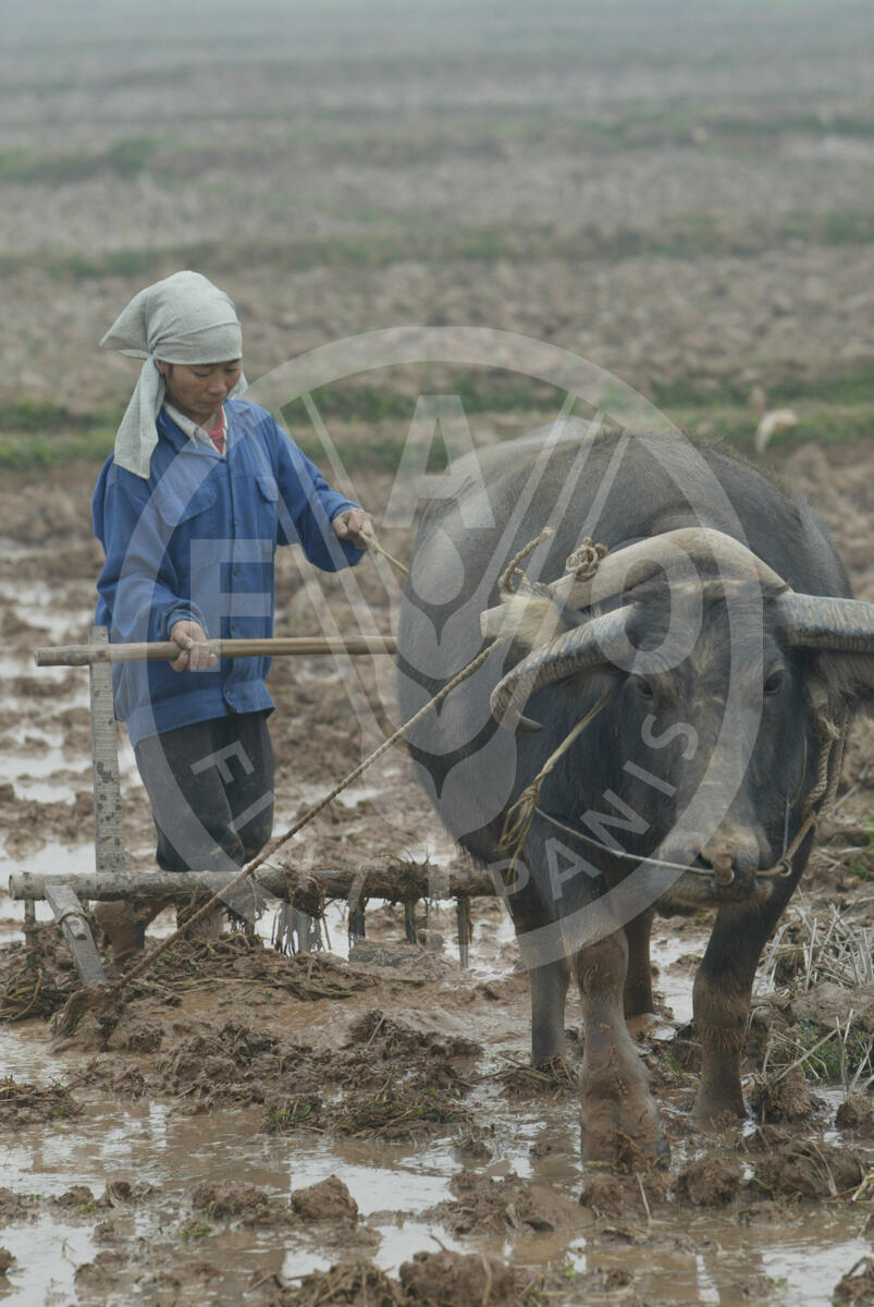 VIET NAM 2005. A farmer and a water buffalo ploughing a muddy rice paddy.