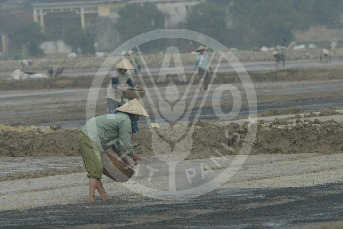 VIET NAM 2005. A woman spreading fertilizer by hand on a vegetable crop.