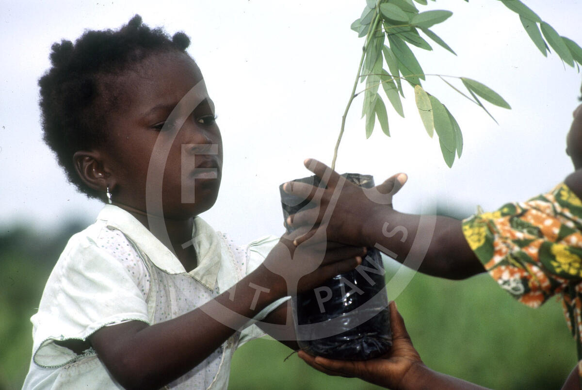 Exact date unknown. Ghana. Village children involved in tree planting. - - Integrated Development of Artisanal Fisheries: IDAF/GHA/93/008. The project aims at improving the working and living conditions of over 75,000 inhabitants in Yeji sector of Lake Volta, through the construction of a Community Fisheries Centre (CFC) with facilities for fish landing, handling, processing and marketing, a
