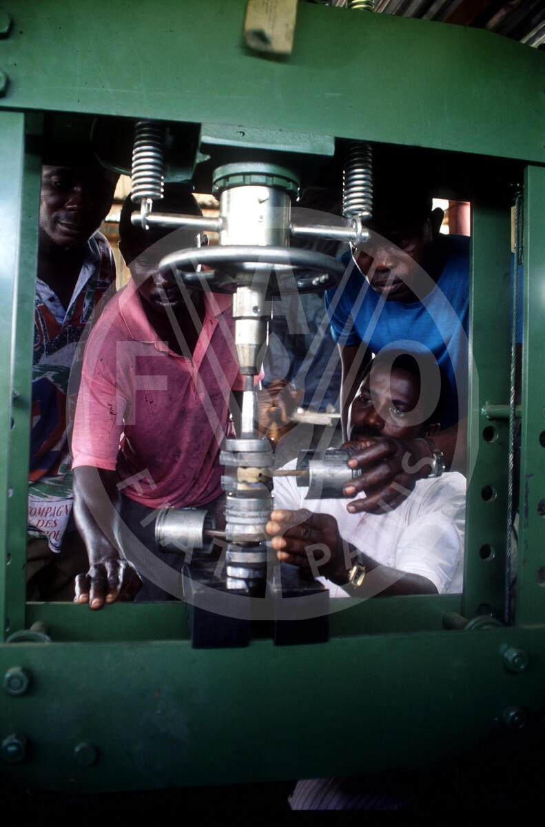 Exact date unknown. Ghana. Outboard engine mechanics at work in IDAF project mechanical workshop. - - Integrated Development of Artisanal Fisheries (IDAF): IDAF/GHA/93/008. The project aims at improving the working and living conditions of over 75,000 inhabitants in Yeji sector of Lake Volta, through the construction of a Community Fisheries Centre (CFC) with facilities for fish landing, handling, processing and marketing, a