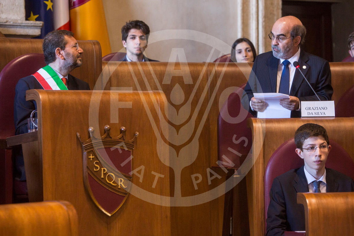 07 June 2015, Rome, Italy - (Left to right) Mayor of Rome Ignazio Marino and FAO Director-General Graziano da Silva. Zero Hunger event: Lectio Magistralis by Former President of Brazil Luiz Inacio Lula da Silva at Rome's Capitolium.