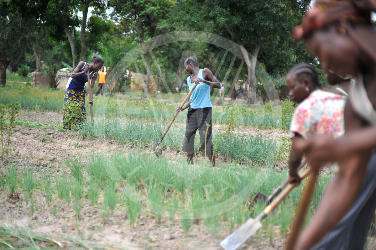 26 May 2012, Bangui, Central African Republic - Women working in an onion field as part of a Farmer Field School for adults with HIV/AIDS.