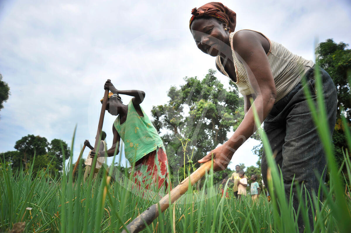 26 May 2012, Bangui, Central African Republic - Women working in an onion field as part of a Farmer Field School for adults with HIV/AIDS.