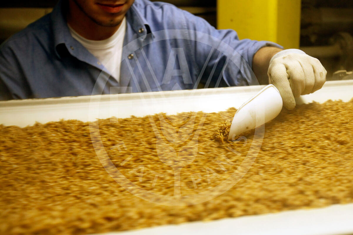 16 April 2012, Pavia - An employee taking a sample of parboiled rice as it travels along the production line inside a rice processing and packaging plant in Pavia, Italy.
