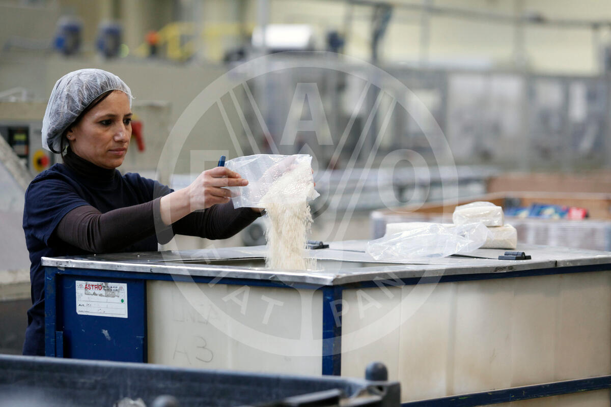 16 April 2012, Pavia - An employee empties out packets of damaged white rice at a rice processing and packaging plant in Pavia, Italy.