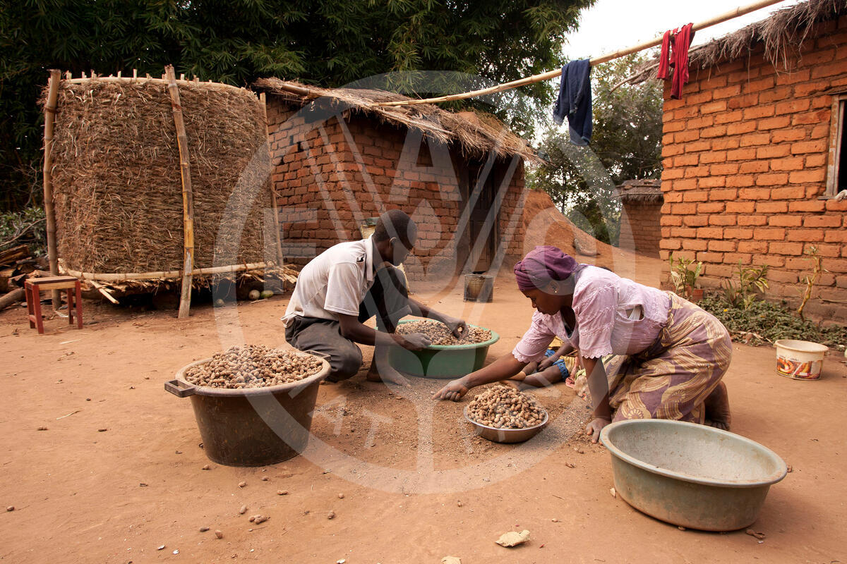 24 May 2013, Mchinji, Malawi- Farmer Antone Dimion and his wife processing groundnuts for storage at Mzingo Village.
