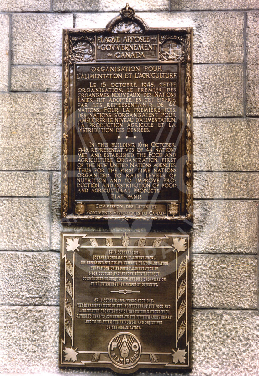 1995 (exact date unknown). Quebec 50th Anniversary - Commemorative plaque - Canada- founding of FAO on which is written: In this building, 16th October, 1945, representatives of 44 nations met and established the Food and Agriculture Organization, first of the new United Nations agencies. Thus for the first time nations organized to raise levels of nutrition and to improve production and distribution of food and agricultural products. FIAT PANIS.