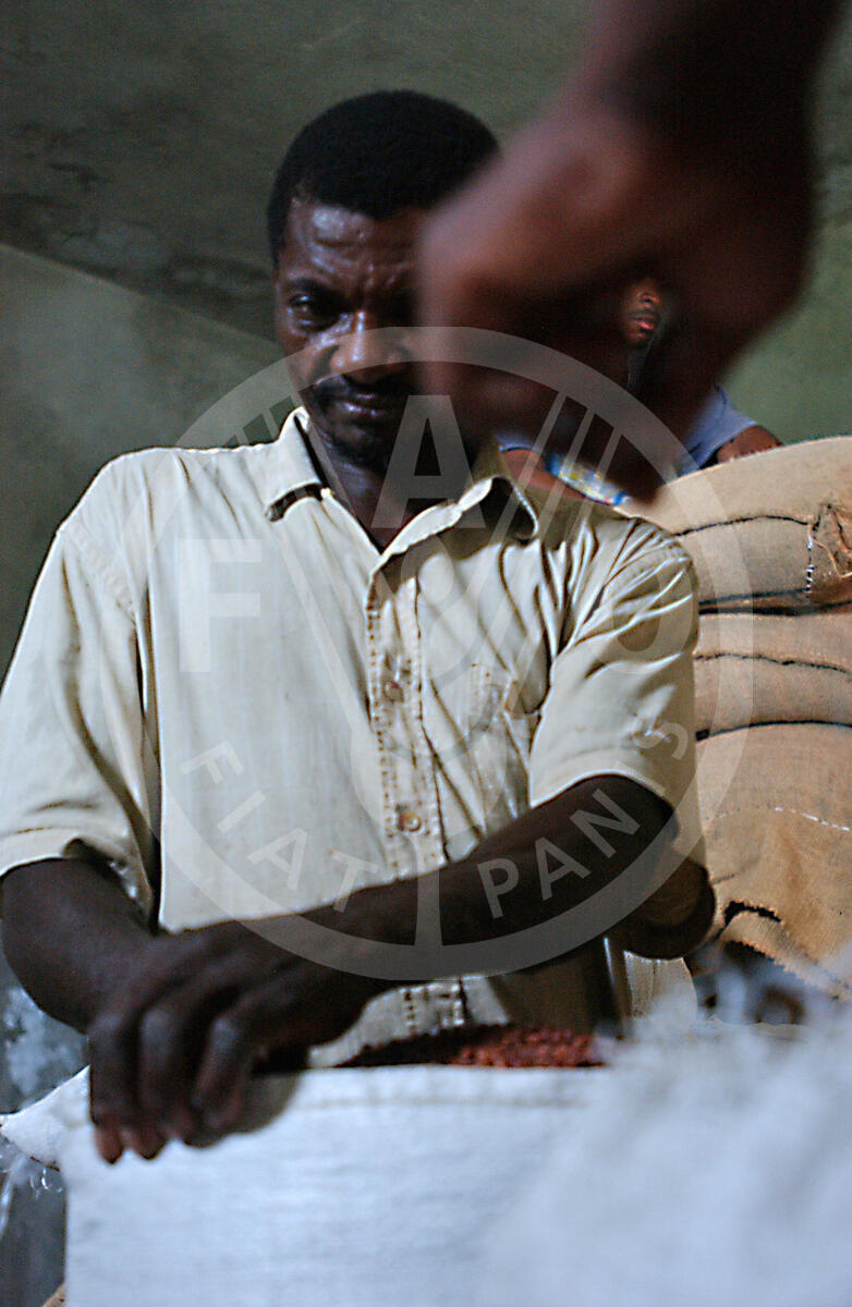 14 June 2010, Les Cayes - Local farmers storing sacks of Cajanus Cajan beans, a fast-growing, disease-resistant bean seed for a post-disaster seed reserve, in a warehouse.