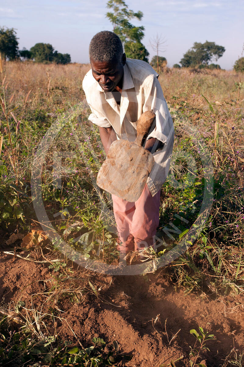 21 May 2013, Mchinji, Malawi- Farmer Daniel Bernard cultivating his garden at Mzingo Village.