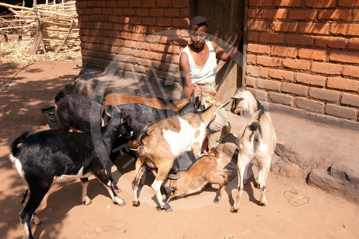 24 May 2013, Mchinji, Malawi- Farmer Stella Jeliati feeding her goats at her home at Mzingo Village.