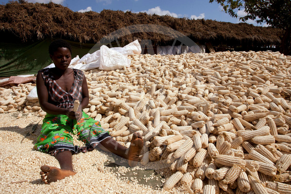 22 May 2013, Mchinji District, Malawi- A woman shelling maize at a farm in Mzingo Village.
