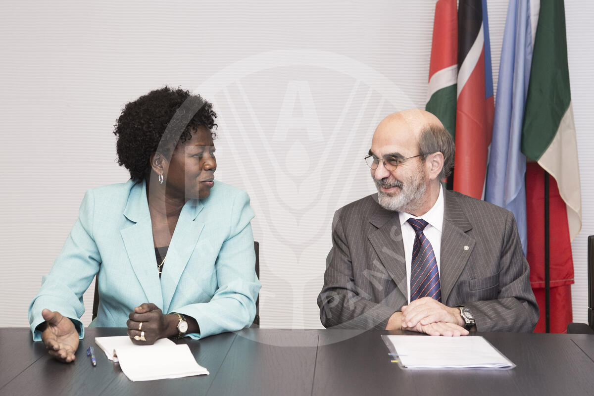 21 June 2013, Rome Italy - Left to Right : H.E. Felix Kiptarus Koskei, Cabinet Secretary, Ministry of Agriculture Livestock and Fisheries of the Republic of Kenya, H.E Betty Achan Ogwaro Minister for Agriculture, Forestry, Cooperative and Rural Development of South Sudan, FAO Director-General, Jose Graziano Da Silva and Giampaolo Cantini Director General for Development Cooperation, Ministry of Foreign Affairs of Italy . Signing Ceremony : Food Security through Commercialization of Agricultural sector in sector in marginalized areas in Kenya and South Sudan under the Comprehensive Africa Agriculture Development Programme Framework, with focus on women anf youth, between FAO, Italy, Kenya and South Sudan.FAO Conference 38th Session, FAO Headquarters, Australia Room.